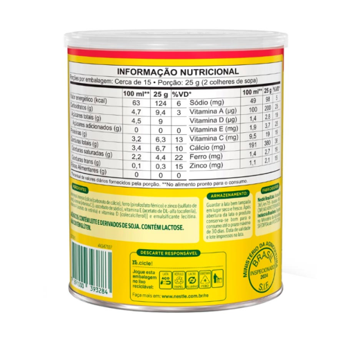 - Leite Integral, [Cálcio (carbonato de cálcio), ferro (pirofosfato férrico) e zinco (sulfato de zinco)], vitaminas [(vitamina C (L-ascorbato de sódio), vitamina E (acetato de DL-alfa-tocoferila), vitamina A (acetato de retinila) e vitamina D (colecalciferol)] e emulsificante lecitina.