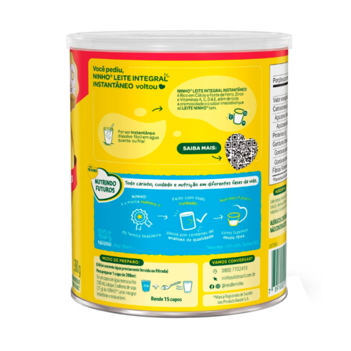 Você pediu, Ninho® Leite Integral Instantâneo voltou Por ser Instantâneo, dissolve fácil em água quente ou fria! Ninho® Leite Integral Instantâneo é Rico em Cálcio e Fonte de Ferro, Zinco e Vitaminas A, C, D & E, além de toda a cremosidade e o sabor irresistível que só Leite Ninho® tem.